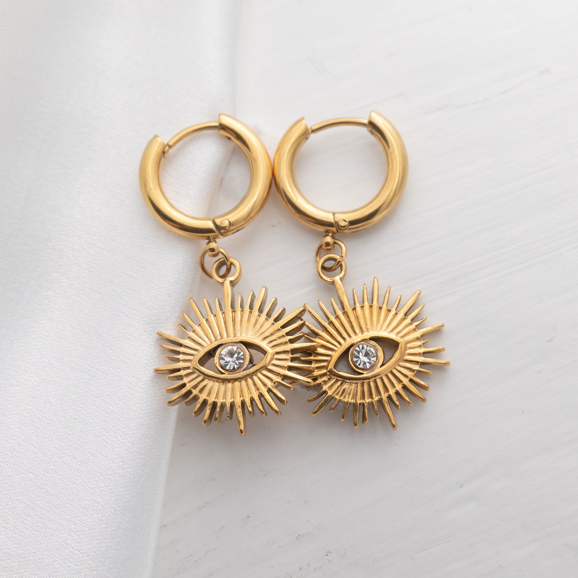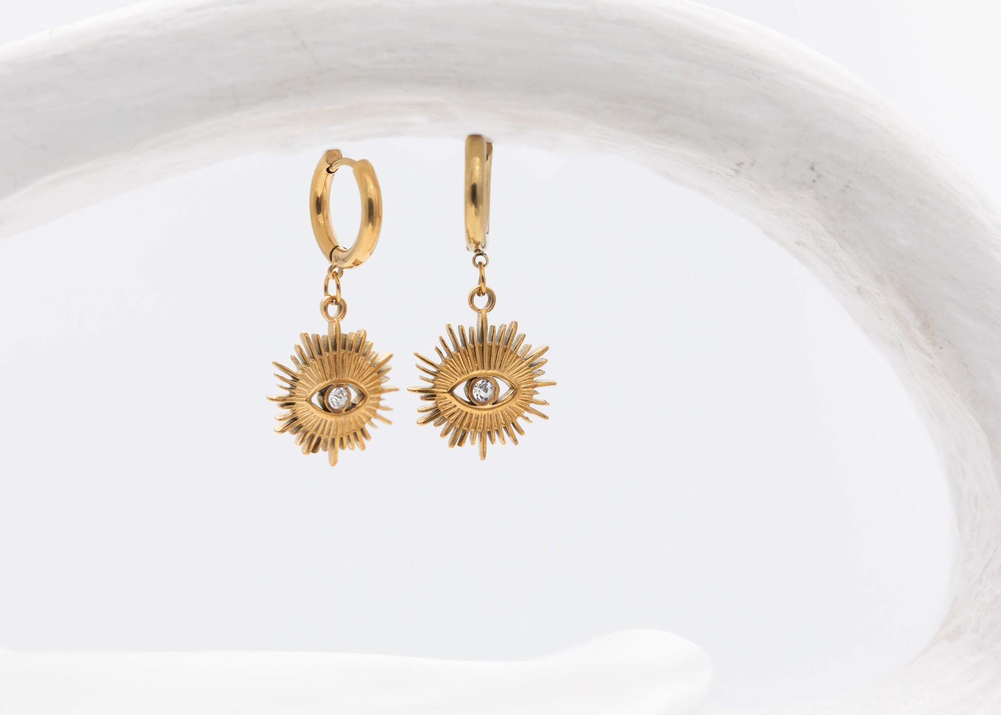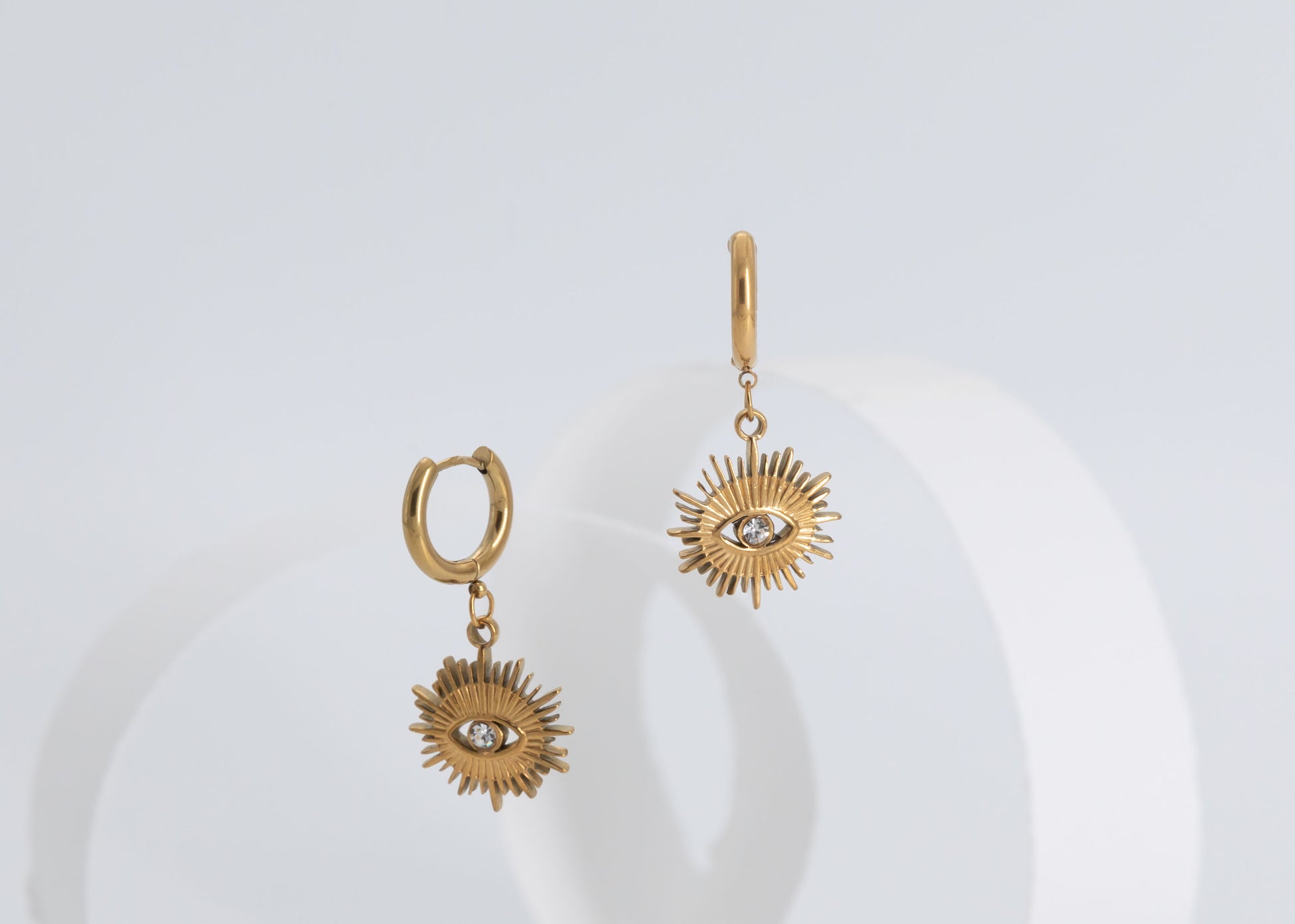 The "All-Seeing Eye Huggie" is a stunning piece of jewellery crafted from radiant gold. Dangling from a gold hoop lies a captivating eye charm, beautifully embellished with a sparkling cubic zirconia at its core. Delicate rays burst outward from the eye, symbolising its all-encompassing vision and wisdom. These exquisite earrings serve as a meaningful talisman, representing protection, intuition, and a keen perception of the world. The wearer will undoubtedly feel empowered and enlightened while donning this enchanting accessory.