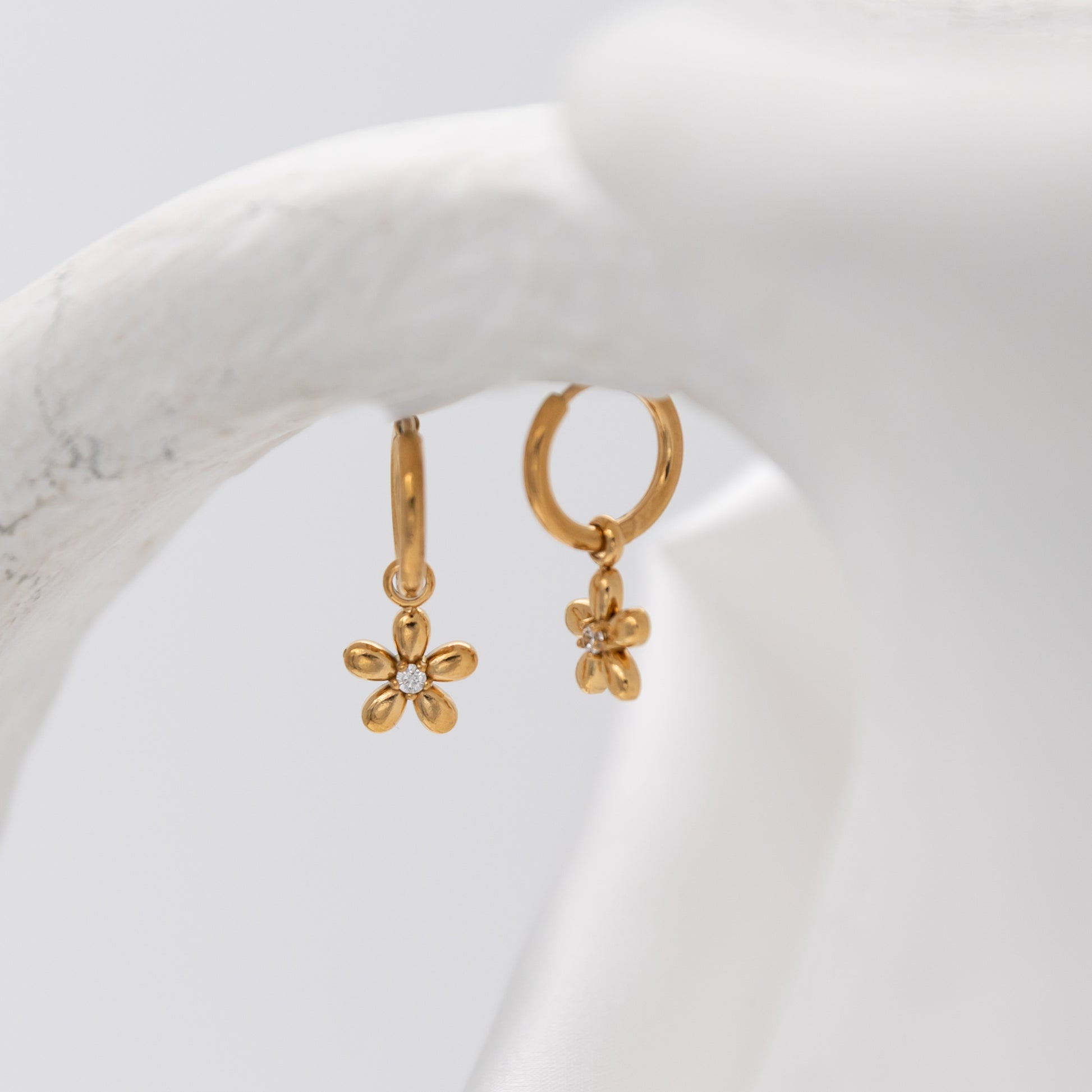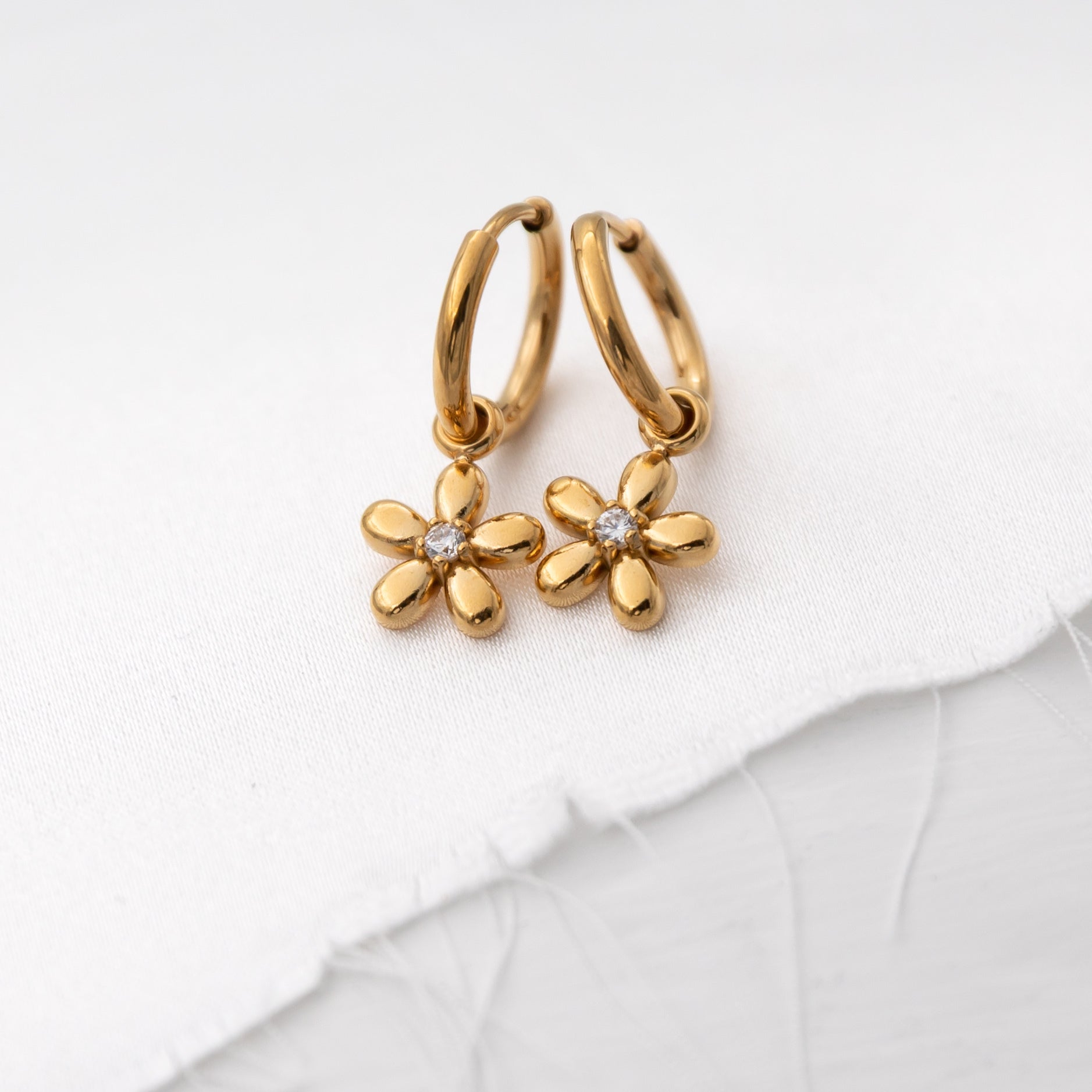 Meet The Bloom Huggie. A delicate flower charm featuring soft rounded petals and a sparkling diamante centre that catches the light beautifully hanging from a golden huggie. This is a two for one earring as can be worn with or without the bloom charm. Add a little floral sparkle to your jewellery collection with the Bloom Huggies.