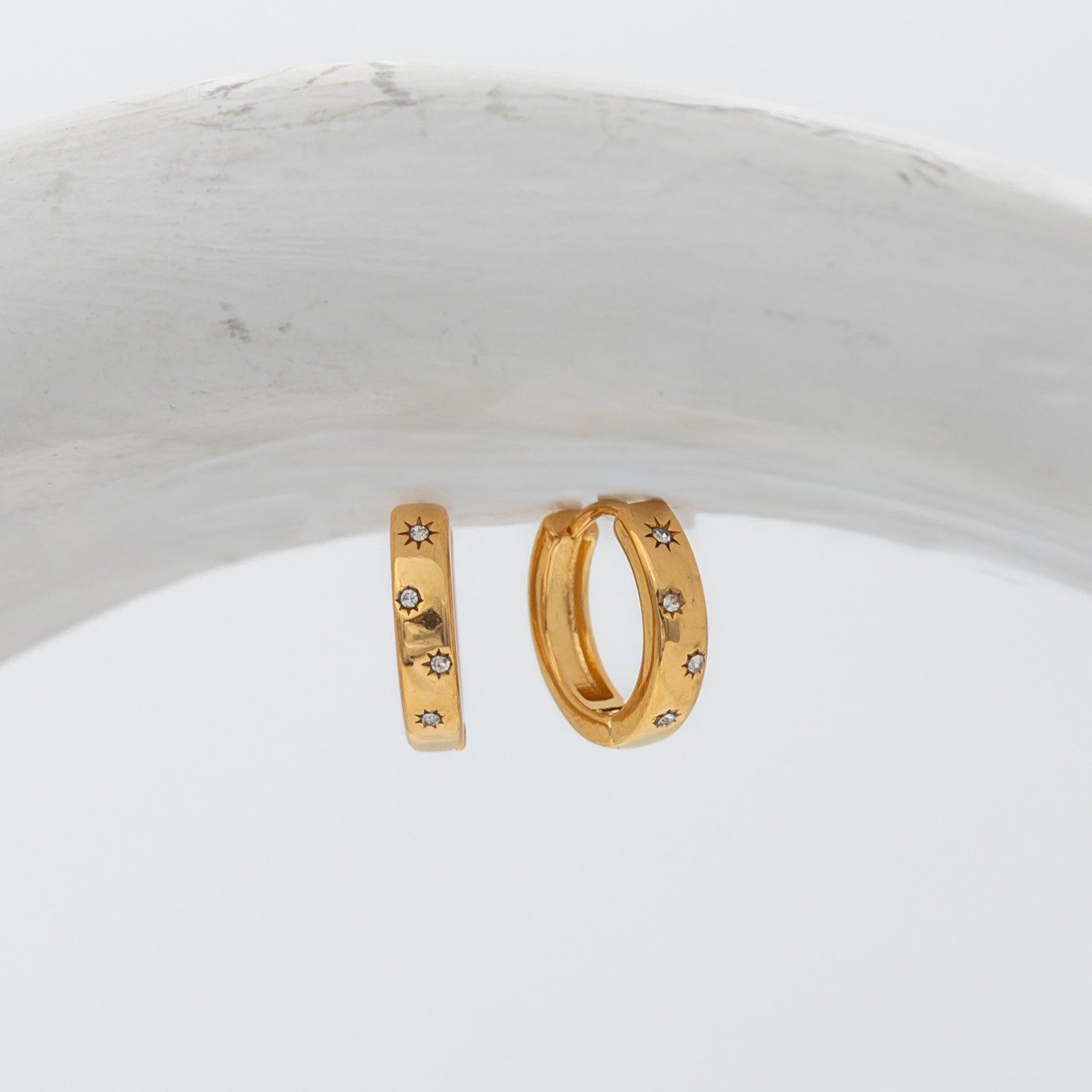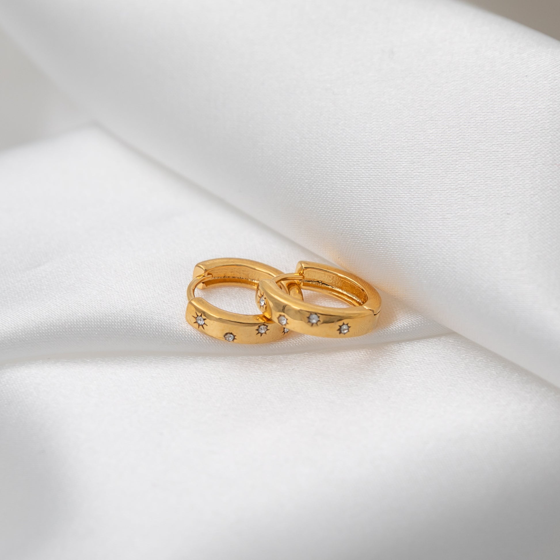 Meet The Elsa. These petite huggies feature a satin finish scattered with tiny cubic zirconia like stars twinkling across a clear night sky. Tiny stars, endless shine. Perfect for everyday wear or stacked with your Empress jewel favourites.