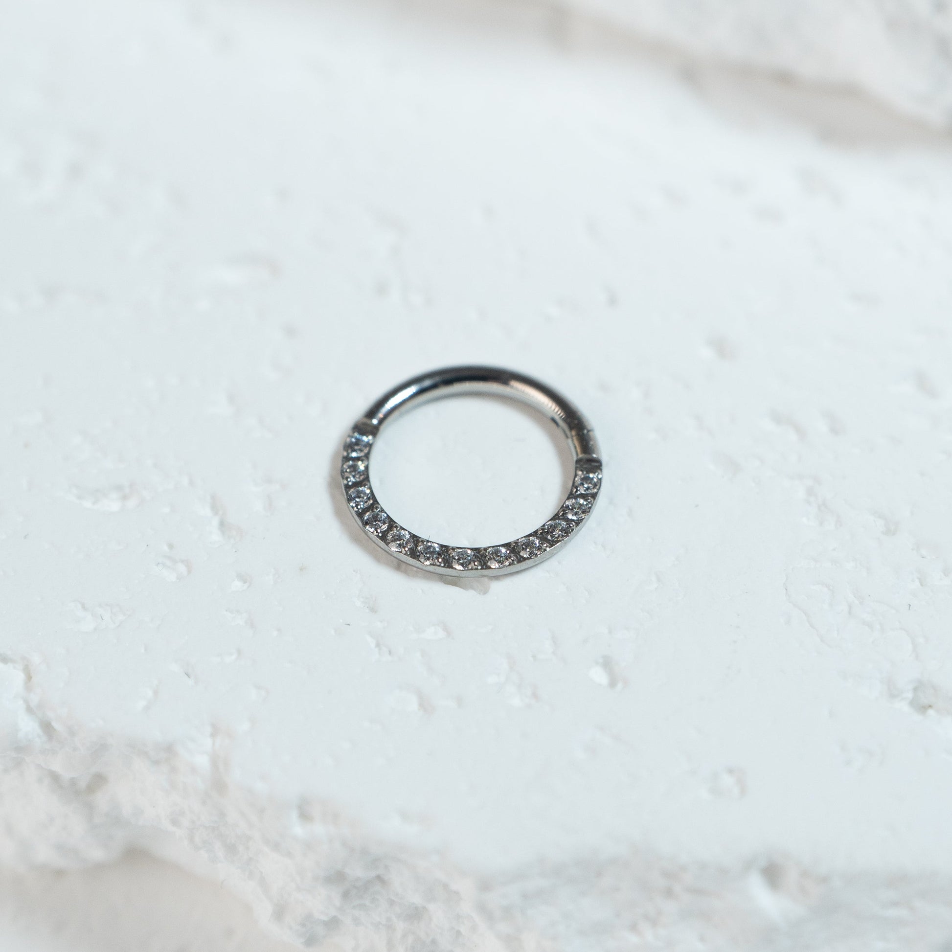 A simple goddess worthy hoop for your septum. Embellished in cubic zirconia stones for a little sparkle and a secure hinged click shut for easy wear.