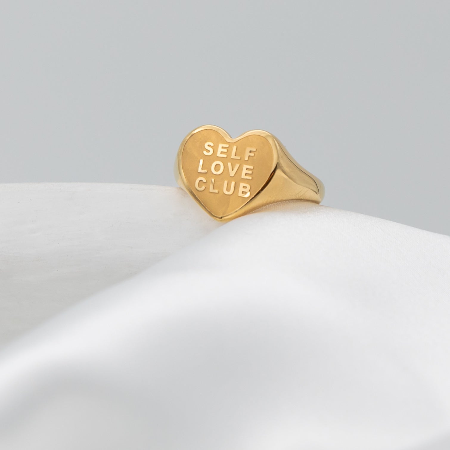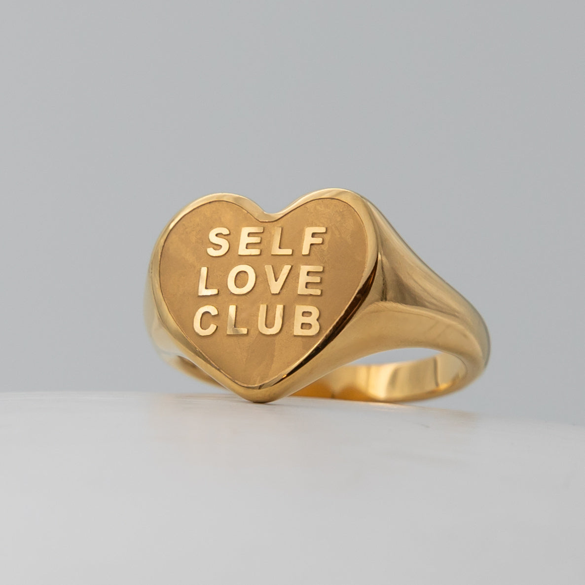 Celebrate YOU with the Self Love Club Ring. Crafted in smooth 18k gold fill, with brushed gold texture, this bold heart design is etched with the words SELF LOVE CLUB as a daily reminder that YOU are your own best vibe. Perfect for stacking or wearing solo, its the ultimate statement of confidence and self care.