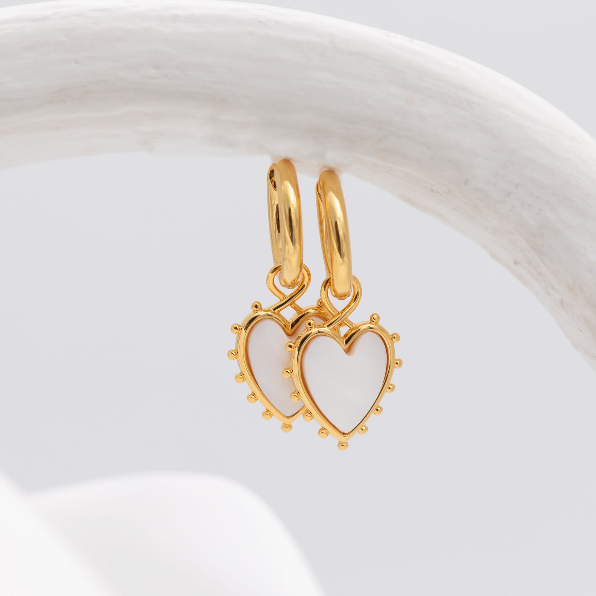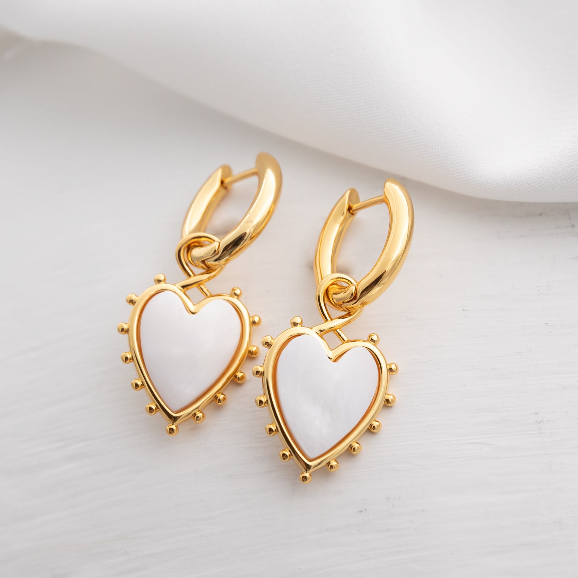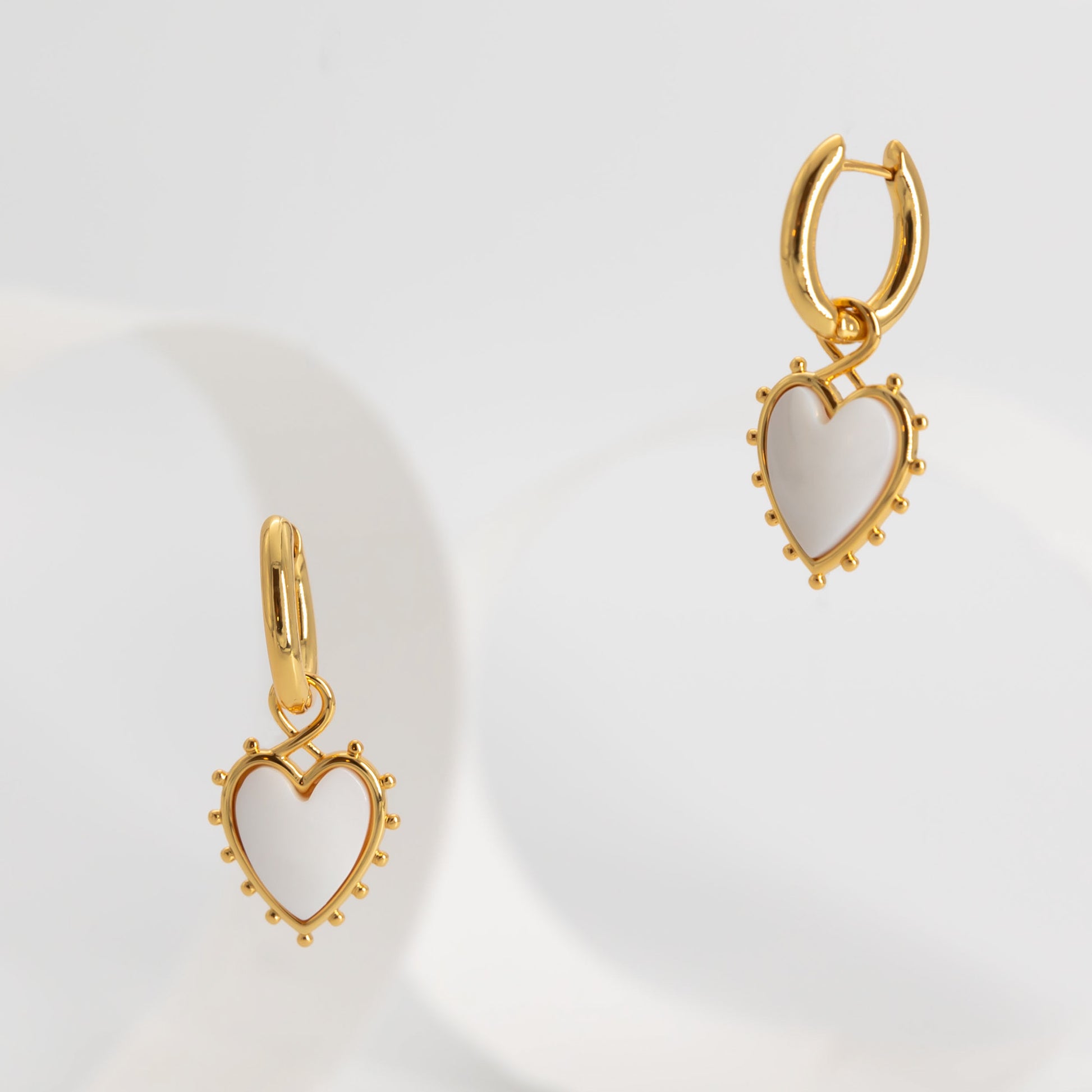 Meet The Snow White Heart Huggie, a charming gold earring that embodies sweetness and grace. Crafted in gleaming gold, this exquisite piece features a delicate white heart charm, exuding purity and love. Adorned with little gold bead accents adding a touch of elegance. The "Snow White Heart" earring is a symbol of pure affection and tender emotions, capturing hearts with its graceful design. Wear it with pride and let its beauty radiate from your ear, as you embrace the enchantment of this golden treasure.