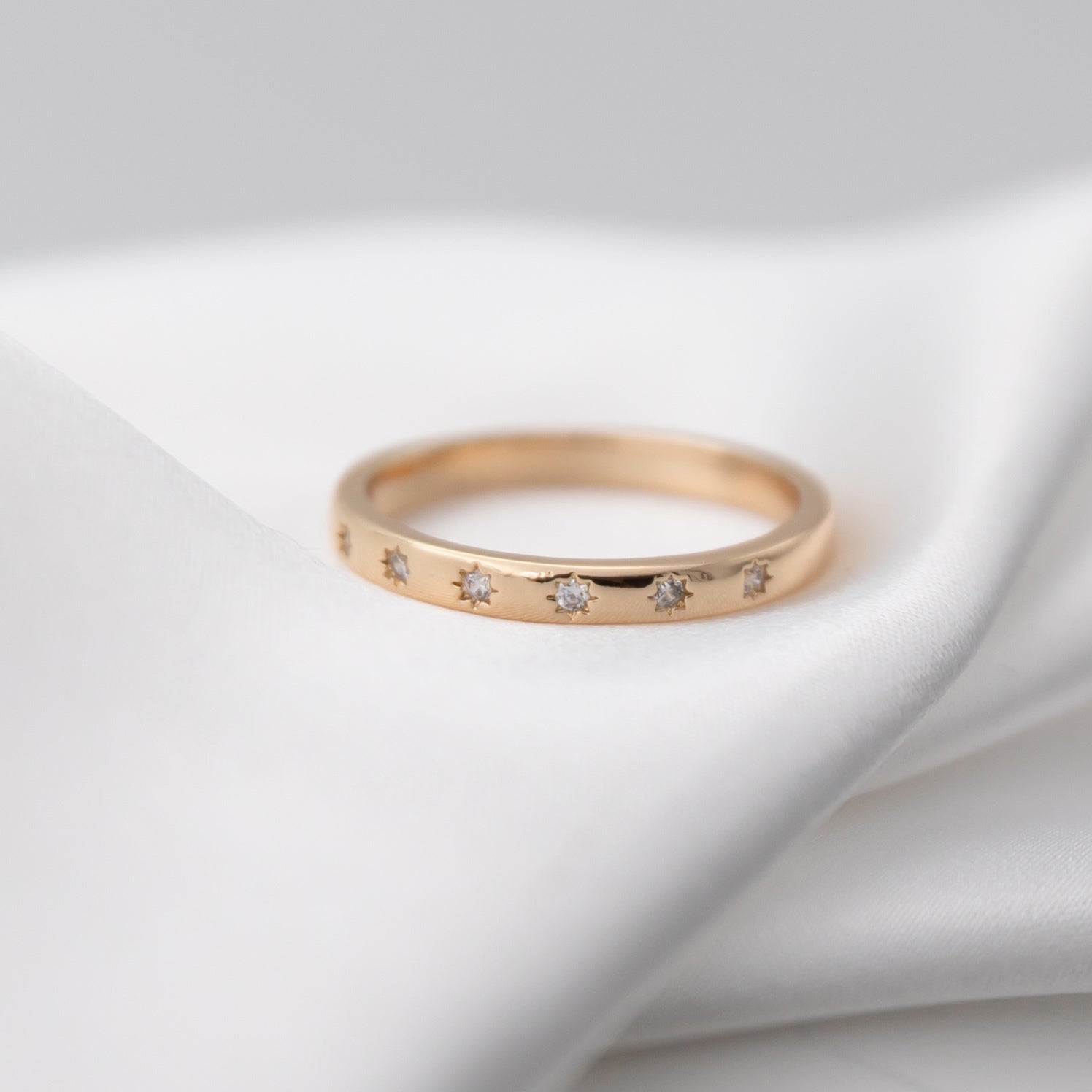 A little sparkle of the universe for your everyday. The Stardust Band features star set stones twinkling across a sleek polished band. A subtle reminder to always keep your eyes on the stars and your heart on your dreams. Perfect for stacking or wearing solo as your signature shine.
