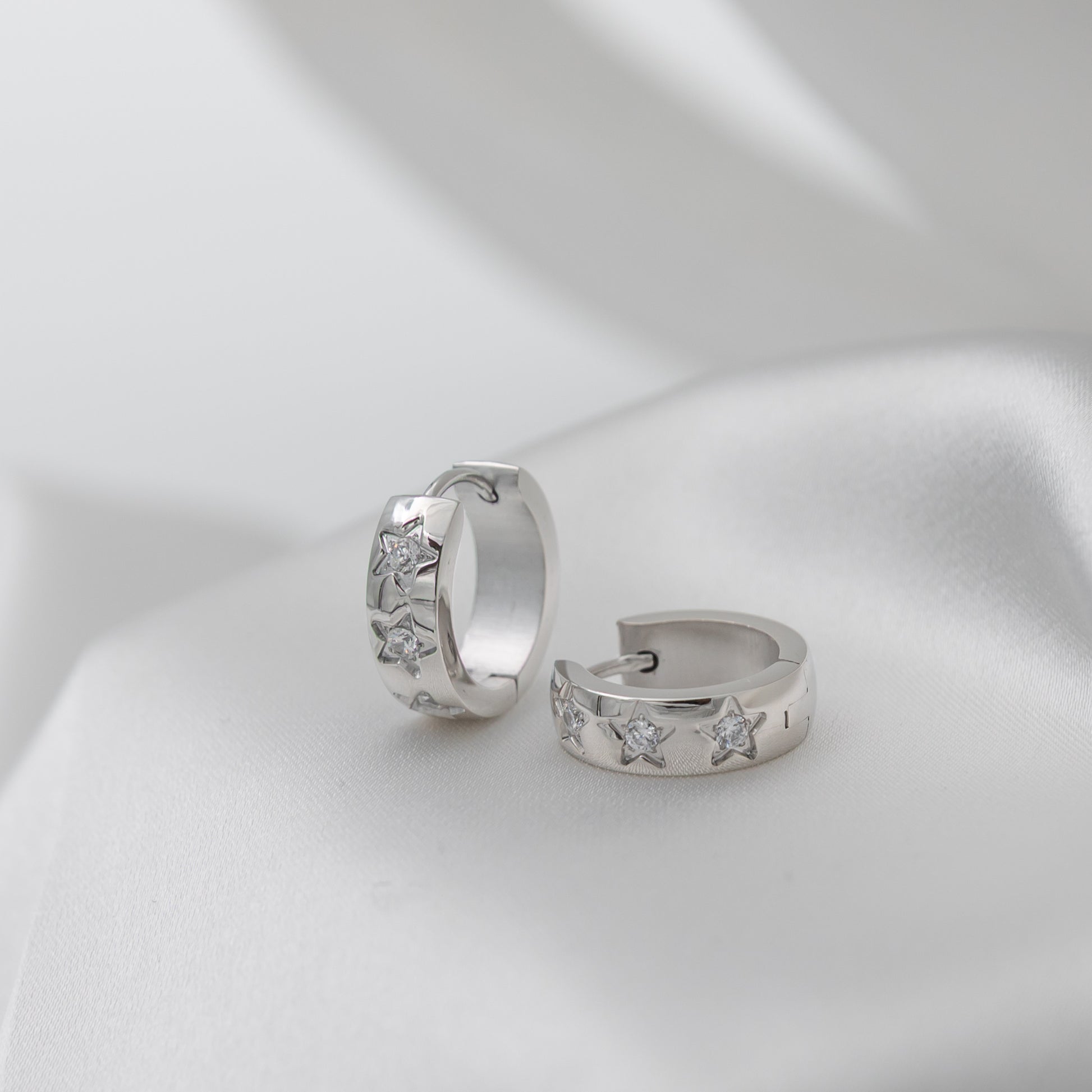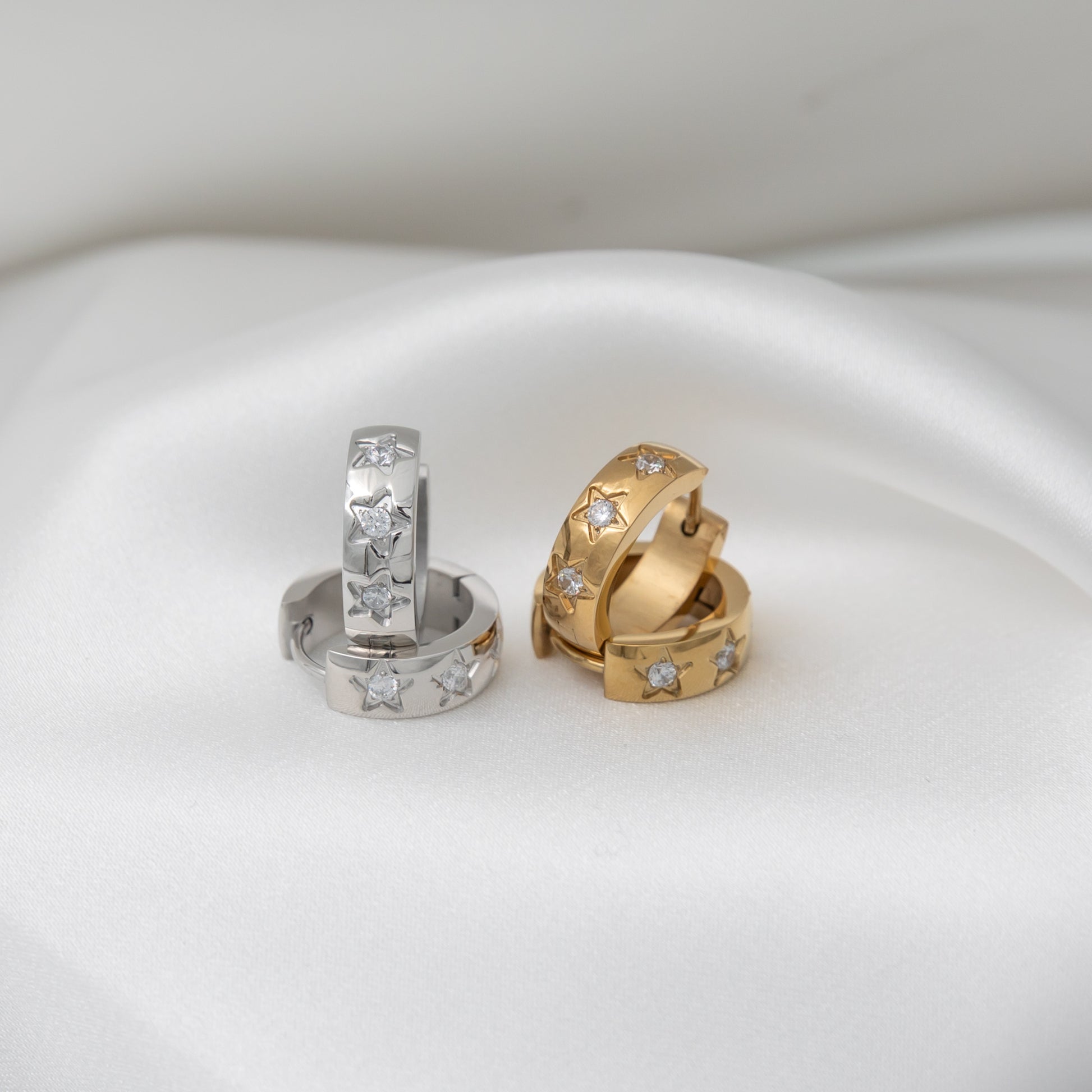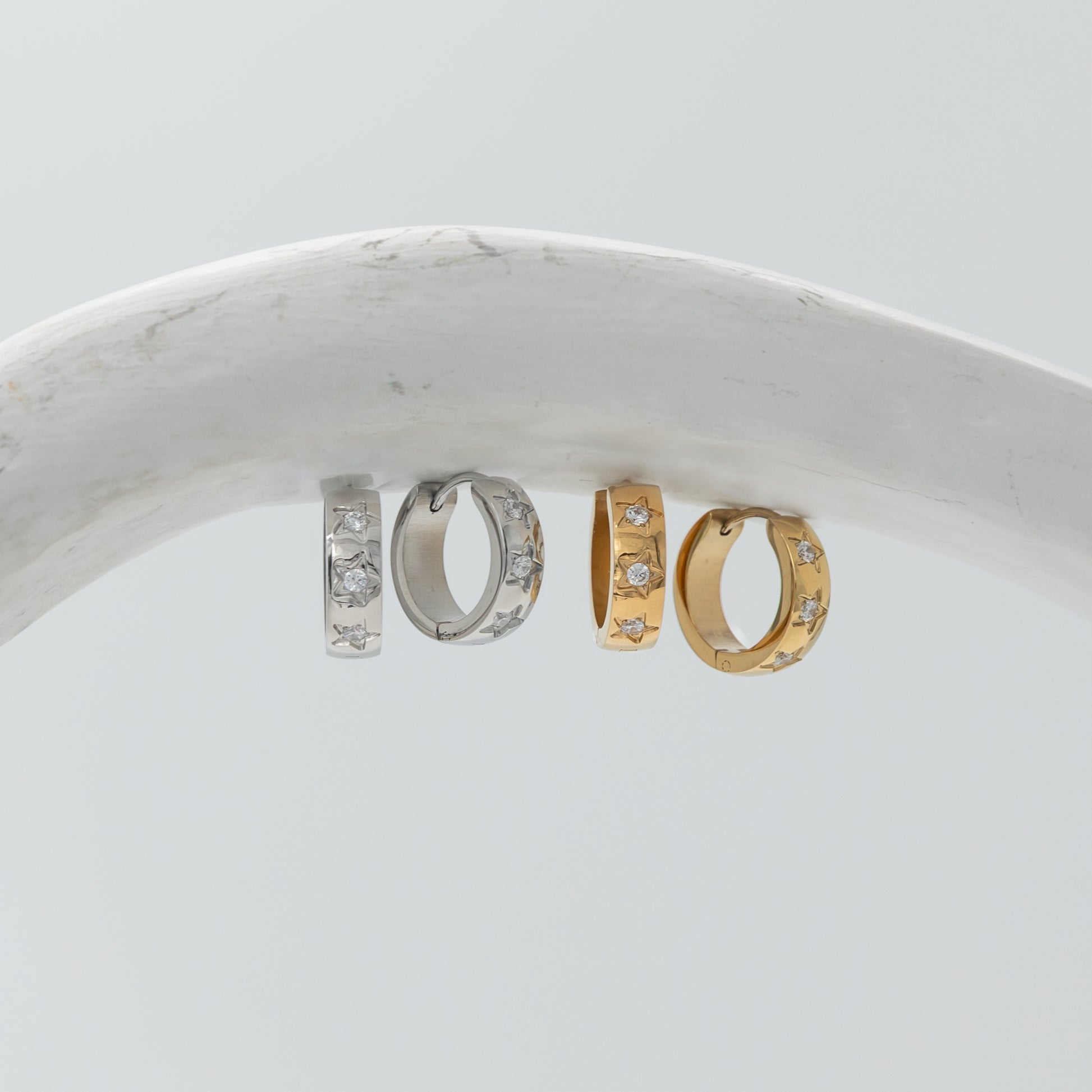 Meet The Astra. A beautiful hoop featuring a constellation of stars etched in detail with handset cubic zirconia that catch the light like a night sky full of stars. Set in a sleek band of gold or silver. Perfect worn alone or stacked with your other Empress Jewel favourites, add a touch of cosmic sparkle to your everyday look with The Astra.