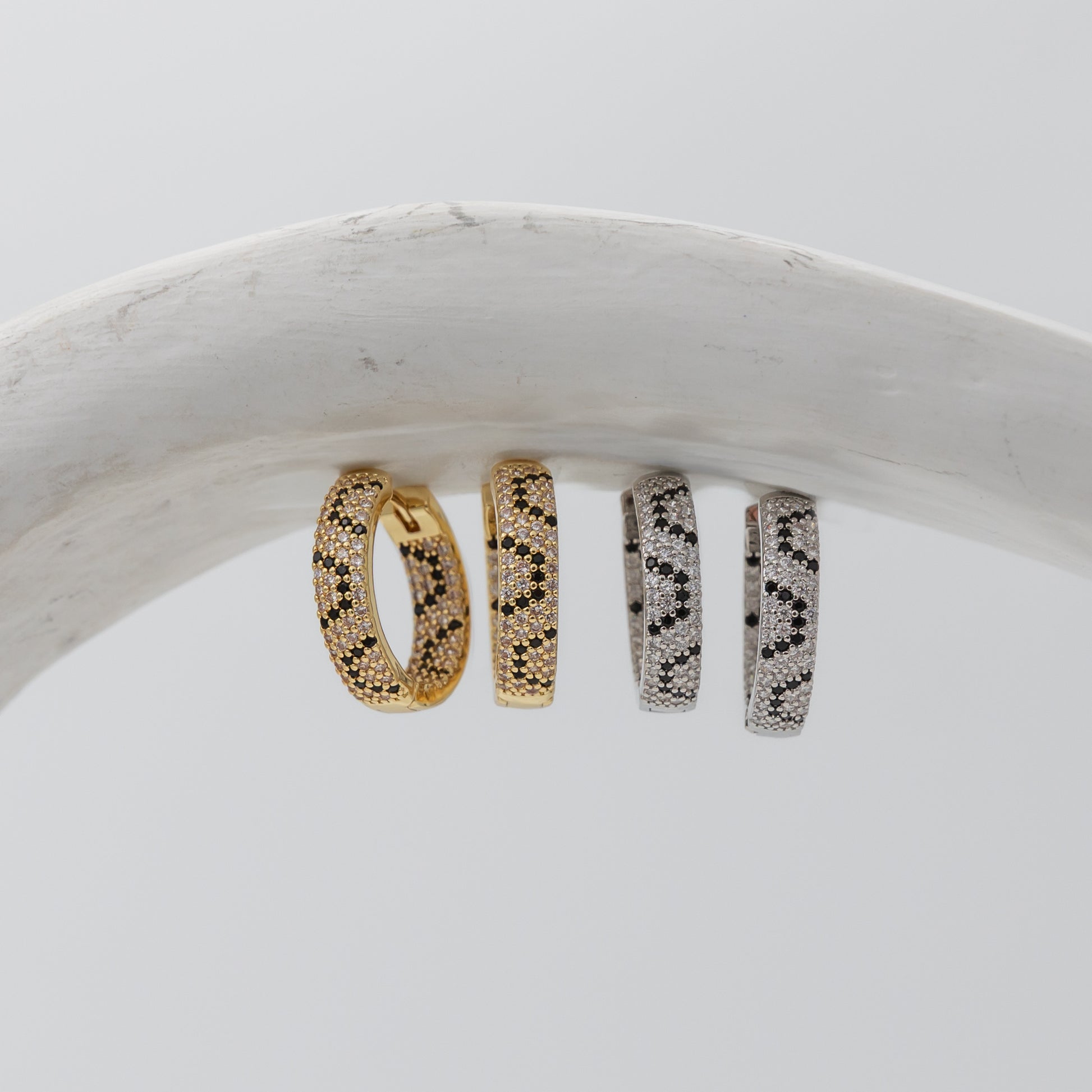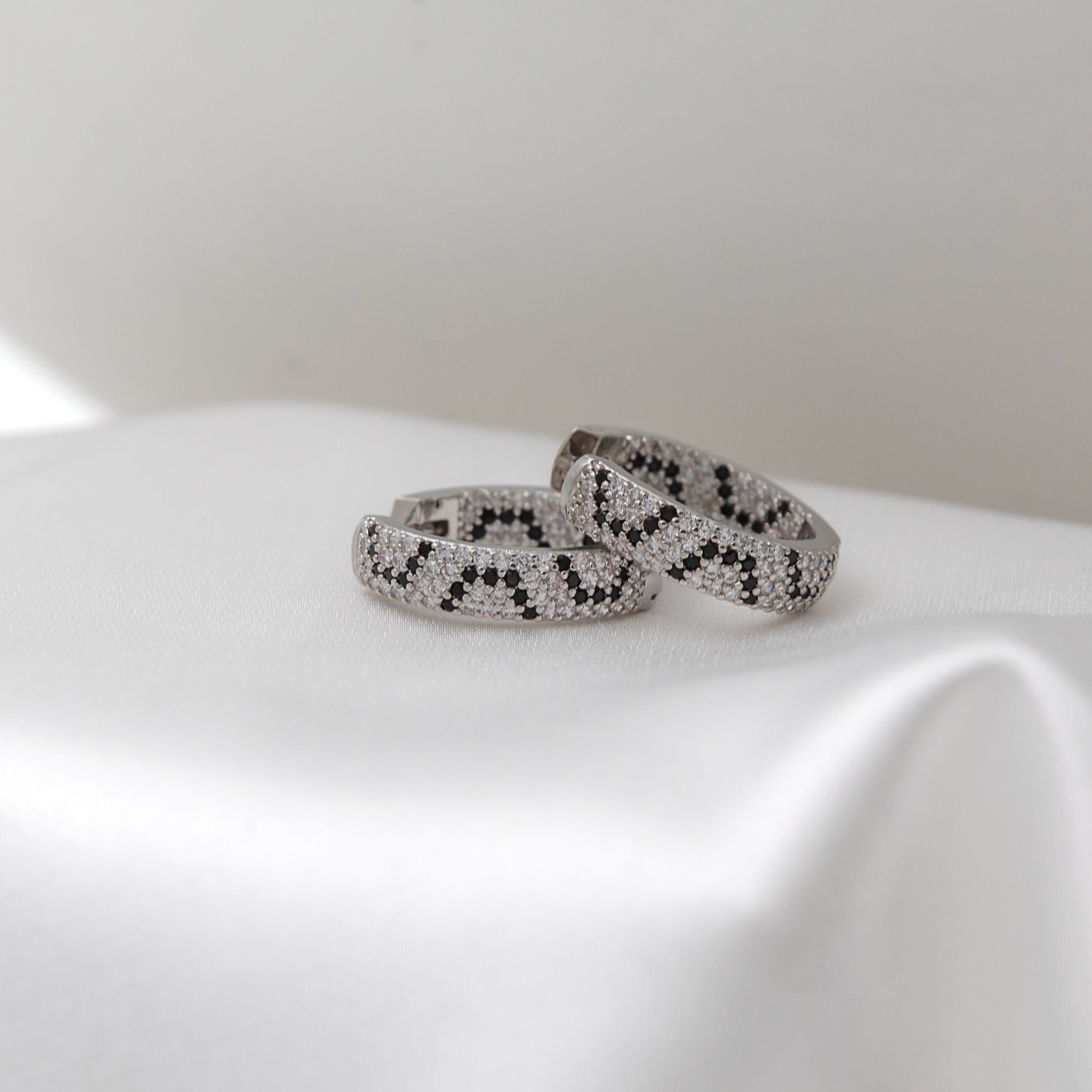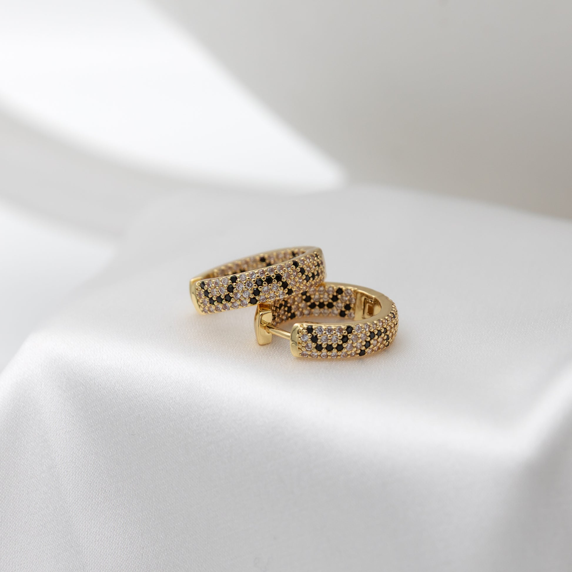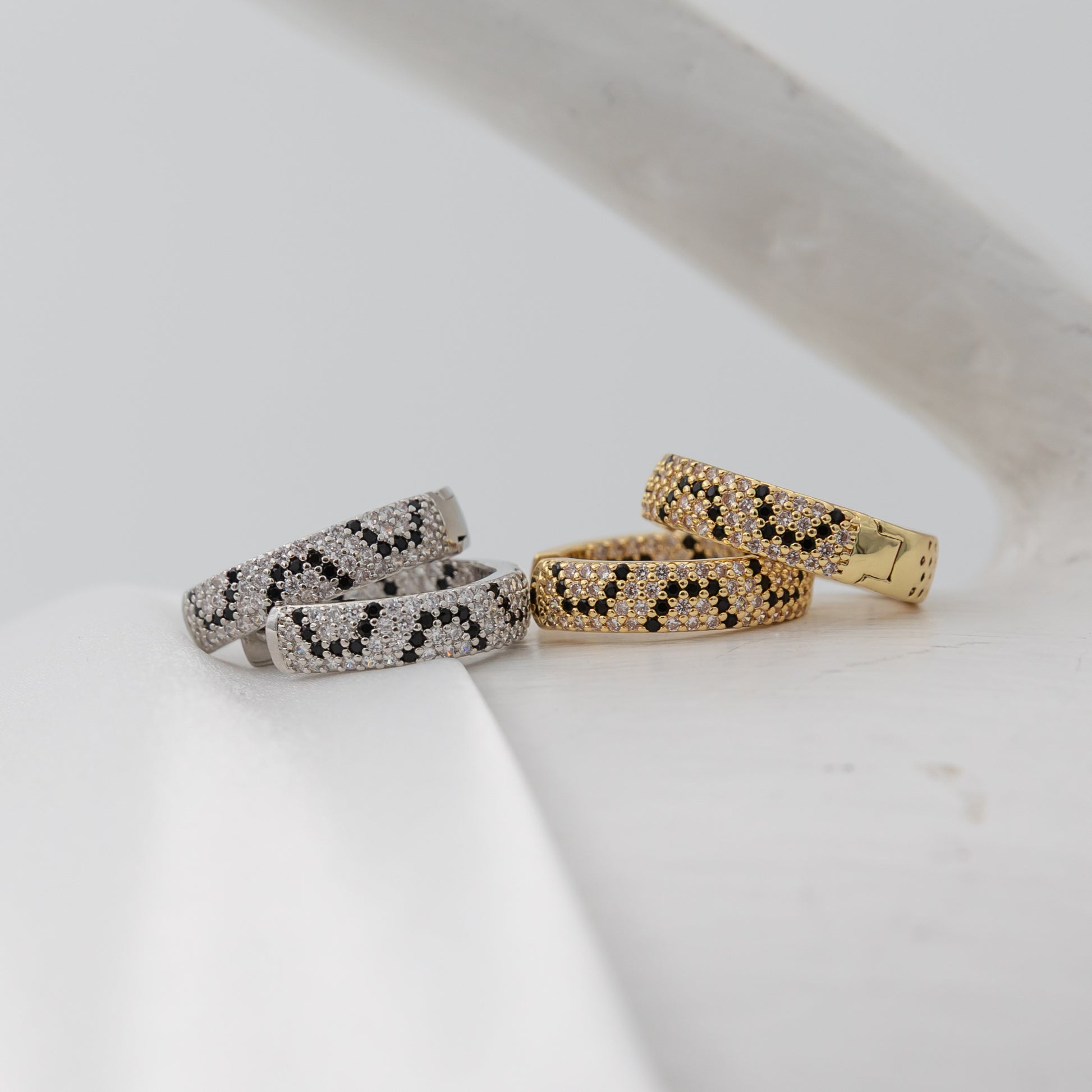 Meet The Eclipse. A beautiful hoop, showcasing dark and light in perfect harmony. These effortlessly chic hoops boast a striking mix of sparkling clear and bold black cubic zirconia creating a hypnotic pattern that catches every flicker of light.